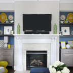 Wall/desk combo in contrasting colors: teal wall background with built in white open shelving and base cabinets