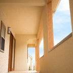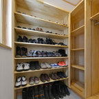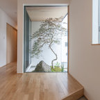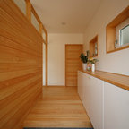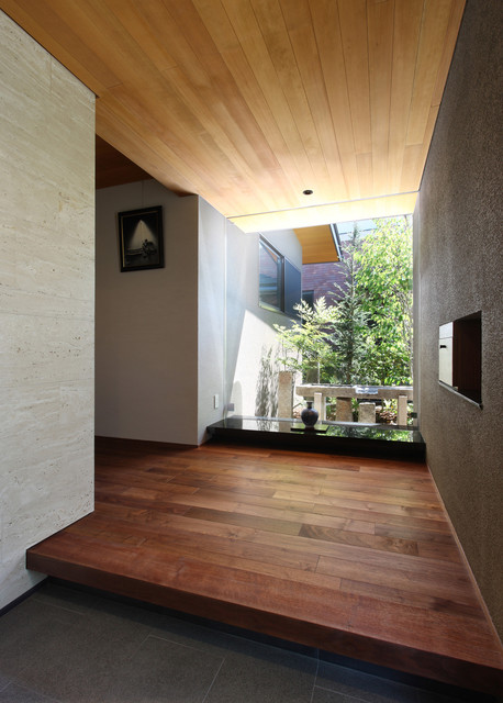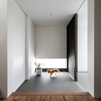 神戸の片開きドアモダンスタイルのおしゃれな玄関 (ベージュの壁、茶色いドア、グレーの床) の写真 — Houzz