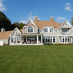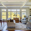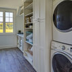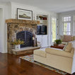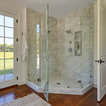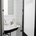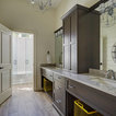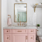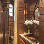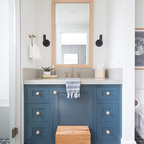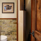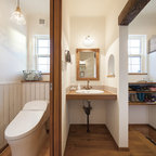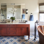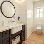 シカゴの大きいカントリー風おしゃれなトイレ・洗面所 (家具調キャビネット、中間色木目調キャビネット、白い壁、ベッセル式洗面器、グレーの床、白い洗面カウンター、珪岩の洗面台) の写真 — Houzz