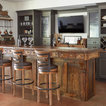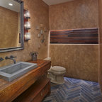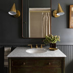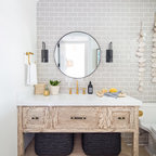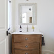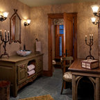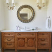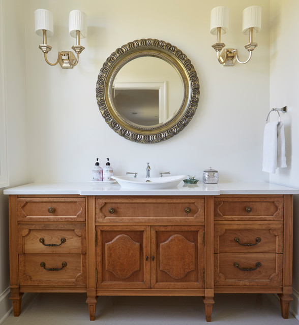 Furniture-like vanity cabinet with vessel sink, ornate mirror, and matching sconces. Photo by Mike Kaskel