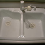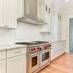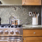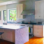 中サイズのコンテンポラリースタイルのおしゃれなキッチン (エプロンフロントシンク、シェーカースタイル扉のキャビネット、白いキャビネット、白いキッチンパネル、シルバーの調理設備の、淡色無垢フローリング、ベージュの床、マルチカラーのキッチンカウンター) の写真 — Houzz