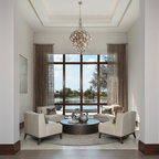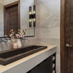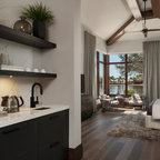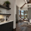 Floor tile for sunken living area. Wood for wine room. Floating shelves with lights in wine area.