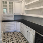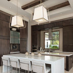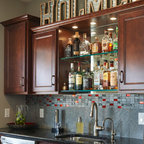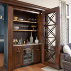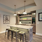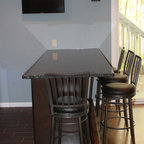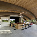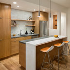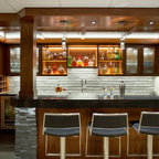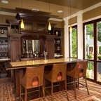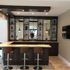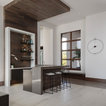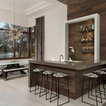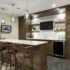 マイアミの中サイズのモダンスタイルのおしゃれな着席型バー (アンダーカウンターシンク、フラットパネル扉のキャビネット、茶色いキャビネット、茶色いキッチンパネル、木材のキッチンパネル、ベージュの床) の写真 — Houzz