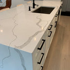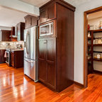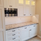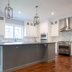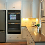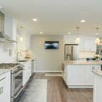 オレンジカウンティのトランジショナルスタイルのおしゃれなL型キッチン (シェーカースタイル扉のキャビネット、白いキャビネット、白いキッチンパネル、シルバーの調理設備、無垢フローリング、茶色い床、白いキッチンカウンター) の写真 — Houzz