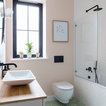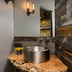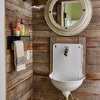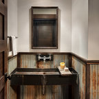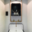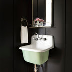 13. Exposed pipes and a salvaged sink make for a hip industrial London powder room, designed by Canham & Hart.