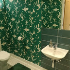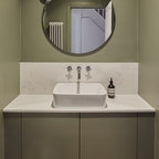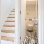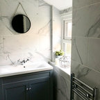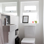 ロンドンの小さい北欧スタイルのおしゃれなトイレ・洗面所 (白いタイル、白い壁、壁付け型シンク) の写真 — Houzz