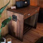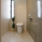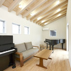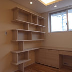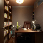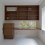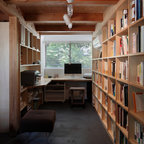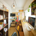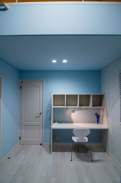 他の地域のモダンスタイルのおしゃれなホームオフィス・仕事部屋 (青い壁、塗装フローリング、自立型机、グレーの床) の写真 — Houzz