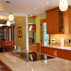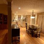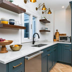 This remodel used a similar footprint but gained some great new use of the space. An overhang to the peninsula for seating, more functional cabinetry with drawer banks and trash pullout, and a custom coffee bar with a vintage window were the big gains in this space. Hardwoods throughout the kitchen and living room meet black and white hex tile in the back hall and powder bath.