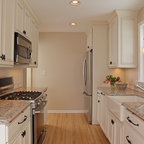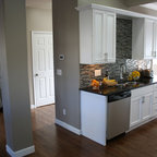 カンザスシティの中サイズのトランジショナルスタイルのおしゃれなキッチン (ダブルシンク、落し込みパネル扉のキャビネット、グレーのキャビネット、クオーツストーンカウンター、白いキッチンパネル、セラミックタイルのキッチンパネル、黒い調理設備、無垢フローリング、茶色い床、白いキッチンカウンター) の写真 — Houzz