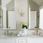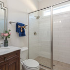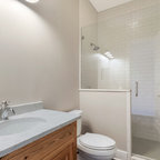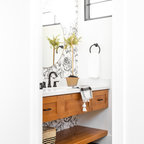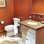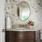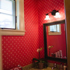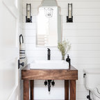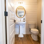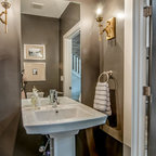 シカゴのカントリー風おしゃれなトイレ・洗面所 (分離型トイレ、グレーの壁、濃色無垢フローリング、ペデスタルシンク、茶色い床) の写真 — Houzz