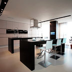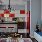 モスクワの小さいコンテンポラリースタイルのおしゃれなキッチン (ドロップインシンク、落し込みパネル扉のキャビネット、白いキャビネット、木材カウンター、白いキッチンパネル、白い調理設備、茶色いキッチンカウンター、マルチカラーの床) の写真 — Houzz