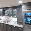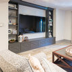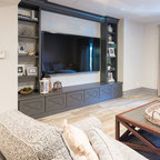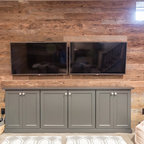 TV Area: Mouser/Centra Cabinetry with full overlay, Orleans door style with Carbide paint. Shelving, drawers, and wood top to match the cabinetry with custom crown and base moulding.