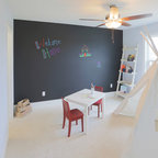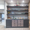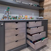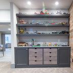 Toy Storage Area: Mouser/Centra Cabinetry with full overlay, Reno door style with Carbide paint. Open drawer storage with roll-out trays and custom floating shelves and base moulding.