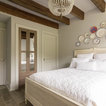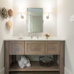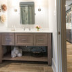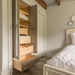 Guest Room/Bath: Mouser/Centra Cabinetry with flush inset, Reno Style doors with Maple wood in Bedrock Stain. Custom vanity base in Full Overlay, Reno Style Drawer in Matching Maple with Bedrock Stain. Vanity Countertop is Everest Quartzite.