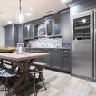 Wet Bar: Mouser/Centra Cabinetry with full overlay, Reno door/drawer style with Carbide paint. Caesarstone Pebble Quartz Countertops with eased edge detail (By MacLaren).