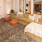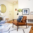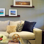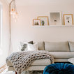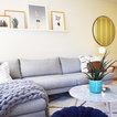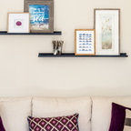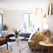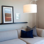 The Burrard sofa from Article is the neutral anchor for this room. We accented with light tables from Article & EQ3. A chunky knit blanket and mudcloth pillows add texture and a crushed velvet pouf adds a pop of rich color. A picture ledge from Room & Board and a cluster of exposed bulb pendants adds a bit of Scandinavian design.