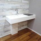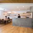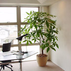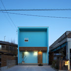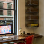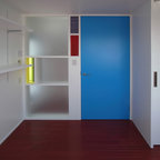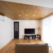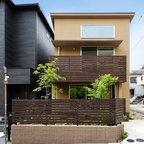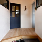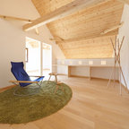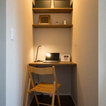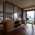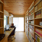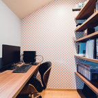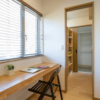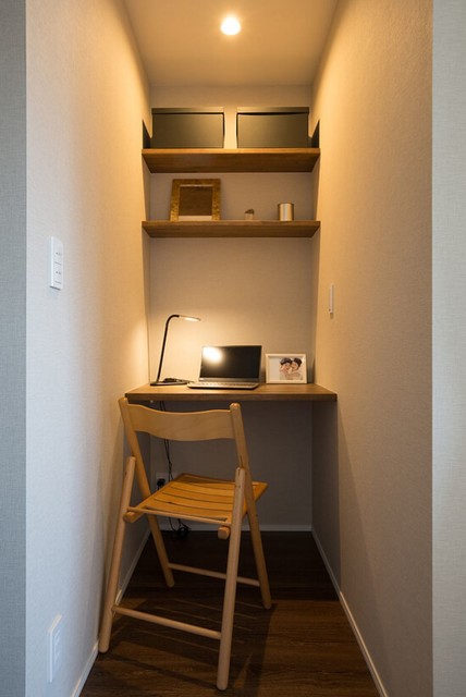 名古屋の小さいモダンスタイルのおしゃれなホームオフィス・仕事部屋 (グレーの壁、濃色無垢フローリング、造り付け机、茶色い床) の写真 — Houzz