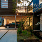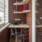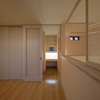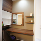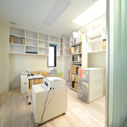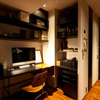 東京都下の小さいモダンスタイルのおしゃれな書斎 (白い壁、無垢フローリング、造り付け机、茶色い床) の写真 — Houzz