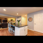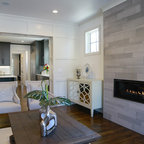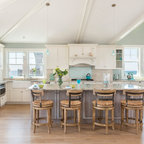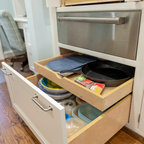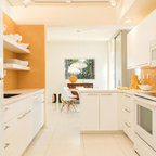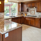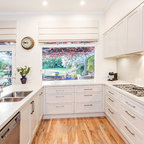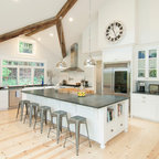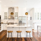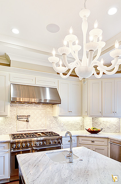 サンフランシスコの広いトランジショナルスタイルのおしゃれなキッチン (シングルシンク、インセット扉のキャビネット、白いキャビネット、大理石カウンター、白いキッチンパネル、石タイルのキッチンパネル、シルバーの調理設備、濃色無垢フローリング) の写真 — Houzz