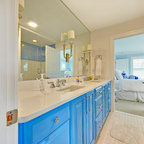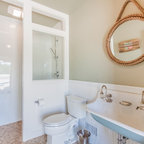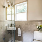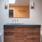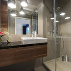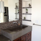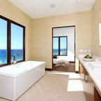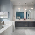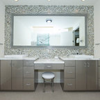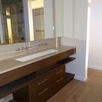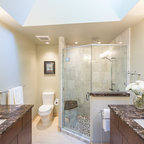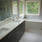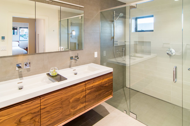 サンディエゴの中サイズのモダンスタイルのおしゃれなマスターバスルーム (フラットパネル扉のキャビネット、中間色木目調キャビネット、コーナー型浴槽、オープン型シャワー、一体型トイレ 、セラミックタイル、グレーの壁、セラミックタイルの床、横長型シンク、人工大理石カウンター) の写真 — Houzz