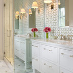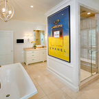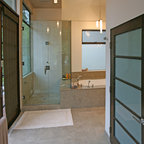 Master bath with floor to ceiling glass shower enclosure.