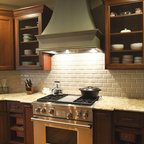 The large granite island countertop creates a dedicated space for food preparation as well as for baking. Custom pull-out drawers were incorporated into the island as a place for laptop storage. A unique backsplash above the range was designed with 3” x 6” field tile, outlined by a liner bar, to draw the eyes attention to the custom Grabill hood.