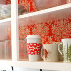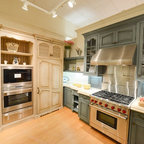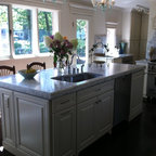 シカゴの大きいトラディショナルスタイルのおしゃれなキッチン (エプロンフロントシンク、インセット扉のキャビネット、白いキャビネット、御影石カウンター、白いキッチンパネル、セラミックタイルのキッチンパネル、パネルと同色の調理設備、無垢フローリング) の写真 — Houzz