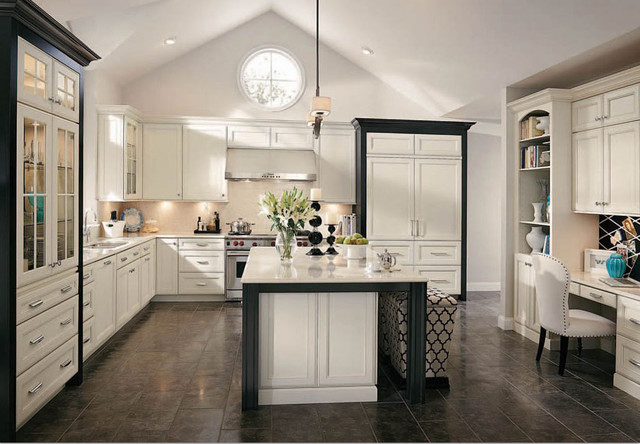 Kitchen designed by Certified Kitchen Design with white cabinets complimented by a black framed columns. With a built in desk and an island with seating for two, this kitchen is perfect getting some work done!