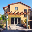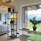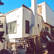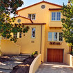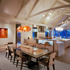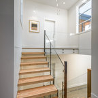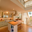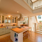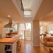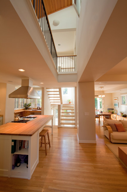 Interior is a surprising contrast to exterior, and feels more Scandinavian than Mediterranean. Open plan joins kitchen, dining and living room to backyard. Second floor with vaulted wood ceiling is seen through light well. Open risers with oak butcherblock treads make stair almost transparent. David Whelan photo