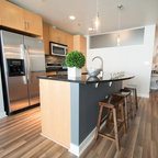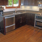 サンディエゴの大きいコンテンポラリースタイルのおしゃれなキッチン (落し込みパネル扉のキャビネット、中間色木目調キャビネット、コンクリートカウンター、セラミックタイルの床、ベージュキッチンパネル、セメントタイルのキッチンパネル、シルバーの調理設備の、ダブルシンク) の写真 — Houzz