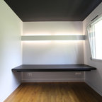 1.くぼみ付きのダブルデスクこちらのふたり用デスクの境目になっているのは、角ばったくぼみの部分。大事な書類を積んで置いたり、お気に入りの本を置くのにもぴったりです。こちらのデザイナーは、机の下の壁面に本棚柄の壁紙を使用して遊び心を演出。