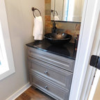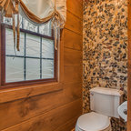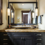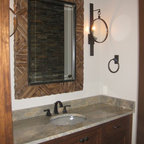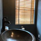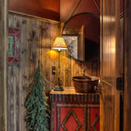 サンフランシスコの中サイズのラスティックスタイルのおしゃれなトイレ・洗面所 (ベッセル式洗面器、フラットパネル扉のキャビネット、濃色木目調キャビネット、木製洗面台、ブラウンの洗面カウンター) の写真 — Houzz