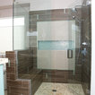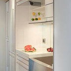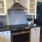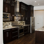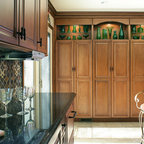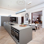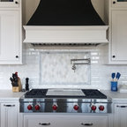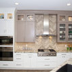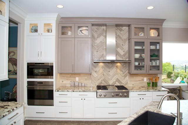 This is a stunning modern kitchen. Sometimes, contemporary design can feel cold or sterile. This kitchen sets itself apart by adding color, warmth, and custom design elements that remain true to modern aesthetic but add in character and personality. The extra tall upper cabinets add height and drama to the space. The glass inserts at the top have lighted interiors which serve as storage and display areas. The Crown molding continues over the stainless hood, bridging the nearly 4 foot gap between the two sides. The grey accent color on the wall cabinets is echoed at the large kitchen island. The soft white perimeter color serves as a great anchor for the bold grey accent. The granite stays true to the color scheme with its white base and grey and black veining. The back splash is a grey vein cut limestone. The glass inset tiles offer color and shine to the subway limestone. At the hood area, the pattern switches to herringbone, but maintains the glass accent. By using the same tile and simply changing the format, we add visual interest to the space without creating competing elements. The built in Wolf convection oven and steam oven are a superior option for any cook. The wood plank floor is actually porcelain tile. Porcelain tile is easier to maintain than wood, and holds up better in heavy traffic or water environments, such as kitchen.