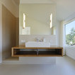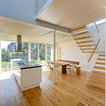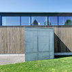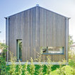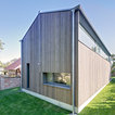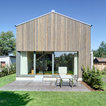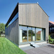 Fassade, Holzverschalung, allerdings etwas zu großflächig, "Fensterband" im ersten Stock. Das Dach sieht irgendwie spannend aus.