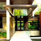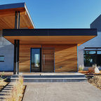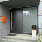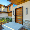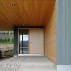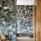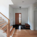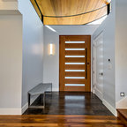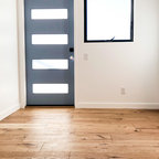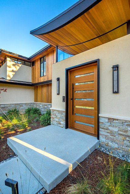 サンディエゴの大きい片開きドアモダンスタイルのおしゃれな玄関ラウンジ (ベージュの壁、コンクリートの床、淡色木目調のドア) の写真 — Houzz