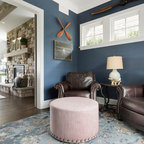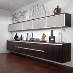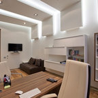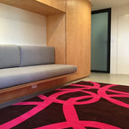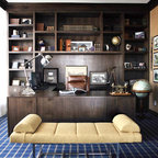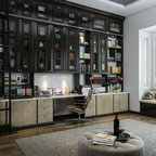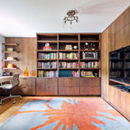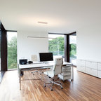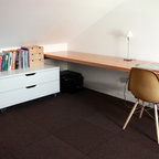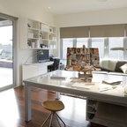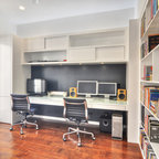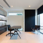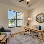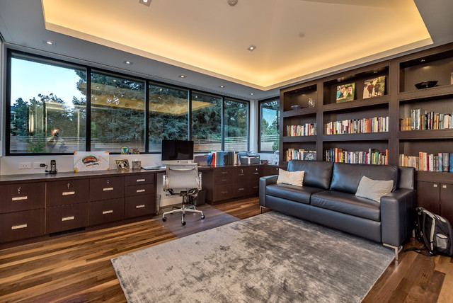 サンディエゴの大きいモダンスタイルのおしゃれな書斎 (グレーの壁、無垢フローリング、暖炉なし、造り付け机) の写真 — Houzz