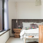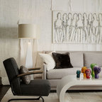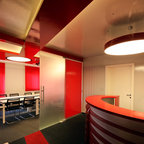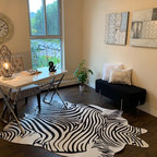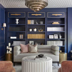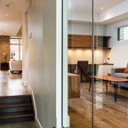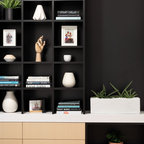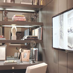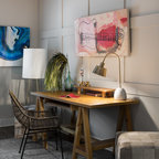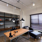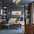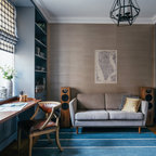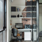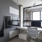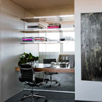 オタワのコンテンポラリースタイルのおしゃれな書斎 (黒い壁、暖炉なし、造り付け机、グレーの床) の写真 — Houzz