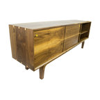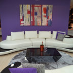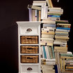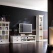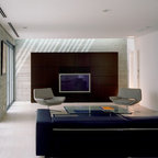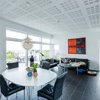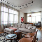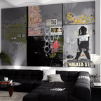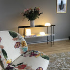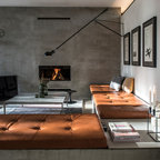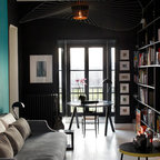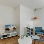コペンハーゲンの大きいコンテンポラリースタイルのおしゃれなリビングロフト (ライブラリー、マルチカラーの壁、淡色無垢フローリング、壁掛け型テレビ) の写真 — Houzz