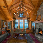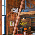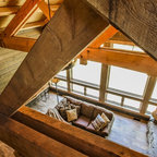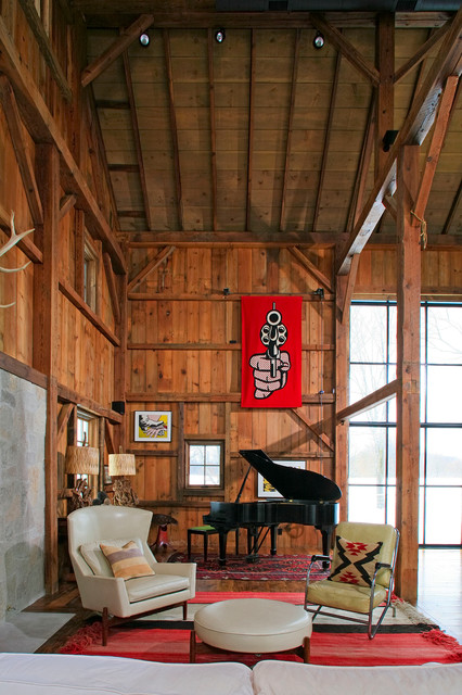 Michigan Barn home - Northworks Architects + Planners - love the house - not fond of the signs, and furnishings except love the grand piano in this rustic room - gives it class...