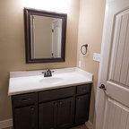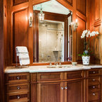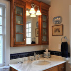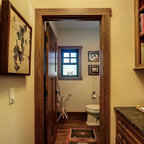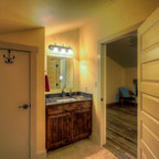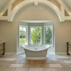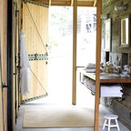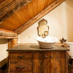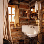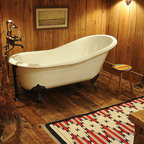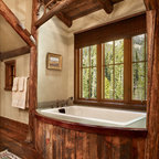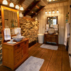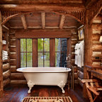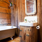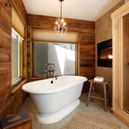 デトロイトのラスティックスタイルのおしゃれな浴室 (置き型浴槽、コンソール型シンク) の写真 — Houzz