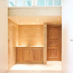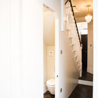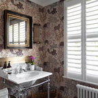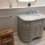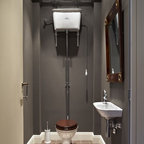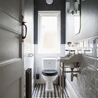 ロンドンの小さいトラディショナルスタイルのおしゃれなトイレ・洗面所 (分離型トイレ、白いタイル、青い壁、大理石の床、サブウェイタイル、コンソール型シンク) の写真 — Houzz