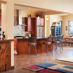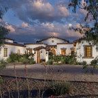 Centered on seamless transitions of indoor and outdoor living, this open-planned Spanish Ranch style home is situated atop a modest hill overlooking Western San Diego County. The design references a return to historic Rancho Santa Fe style by utilizing a smooth hand troweled stucco finish, heavy timber accents, and clay tile roofing. By accurately identifying the peak view corridors the house is situated on the site in such a way where the public spaces enjoy panoramic valley views, while the master suite and private garden are afforded majestic hillside views.