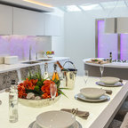 ロンドンのコンテンポラリースタイルのおしゃれなキッチン (アンダーカウンターシンク、フラットパネル扉のキャビネット、白いキャビネット、赤いキッチンパネル、ガラス板のキッチンパネル、シルバーの調理設備) の写真 — Houzz