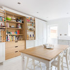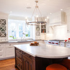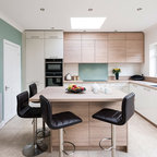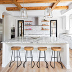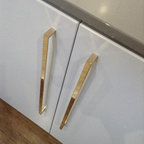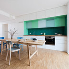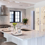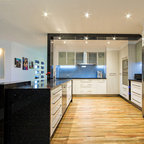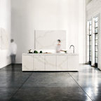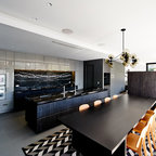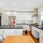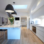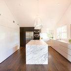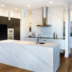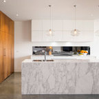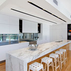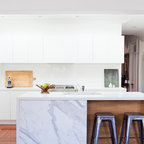 メルボルンのコンテンポラリースタイルのおしゃれなアイランドキッチン (フラットパネル扉のキャビネット、白いキャビネット、白いキッチンパネル、無垢フローリング、大理石の床) の写真 — Houzz