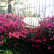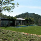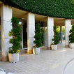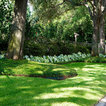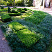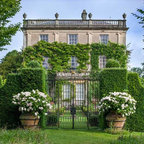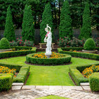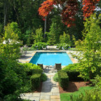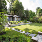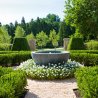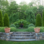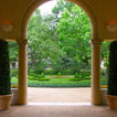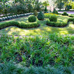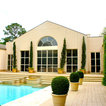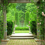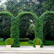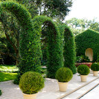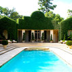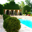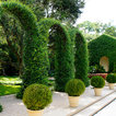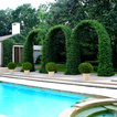 Grand ivy-covered arches mirror container-grown boxwood spheres beside the pool.