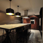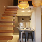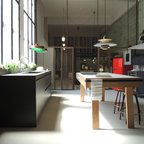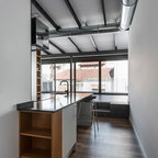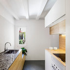 バルセロナの大きいインダストリアルスタイルのおしゃれなキッチン (白いキッチンパネル、オープンシェルフ、白いキャビネット、人工大理石カウンター、サブウェイタイルのキッチンパネル、シルバーの調理設備、無垢フローリング) の写真 — Houzz