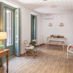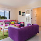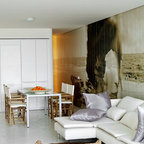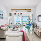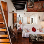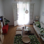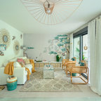 バルセロナの広いトロピカルスタイルのおしゃれな独立型リビング (フォーマル、白い壁、カーペット敷き、暖炉なし、埋込式メディアウォール) の写真 — Houzz