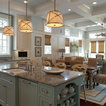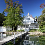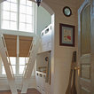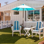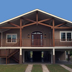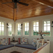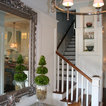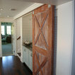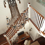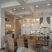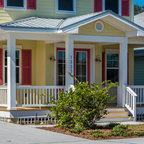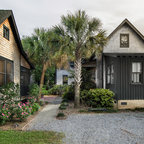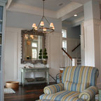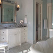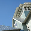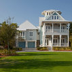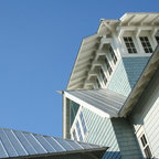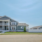 All exterior colors are Sherwin Williams. The original wall (Hardy Plank siding) color was Tradewinds (SW 6218) but we recently repainted the front porch and found it necessary to switch. After five years of sun, the color had faded to more of a blue-grey tone and the best match I could find was Misty (SW 6232). The trim color is Oyster (SW7637. The garage door as well as the porch ceiling color is Moody Blue- SW 6221. Fot the shingle colors- we tried something new- mixed stain with paint (Rain- SW 6219) (using a 5 to 1 stain/paint mix) and dipped the shingles in this once or twice.