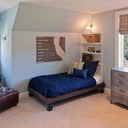 活気をつけるアクセントの赤風合いのある古材を使ったデスクによく似合う、落ち着いたダークブルーの壁。ブルー系の効果は先程のご説明の通りですが、ここに、活力を与えるといわれる赤を少しだけプラスすると、勉強にさらに気合が入るのではないでしょうか。興奮色である赤はあまり使うと気が散ってしまうので、あくまでポイントづかいがおすすめですが、少し加えるだけでも、寒色をメインにした空間を一気に温め、元気にしてくれる効果があります。