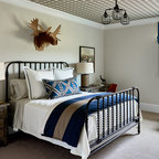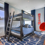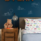 古材の天板×シルバーのボックス使いがインテリアにマッチ朽ちた風合いの天板とシルバーボックスを組み合わせた、男の子が飛びつきそうなかっこいいデスク。片側にはスタッキング可能なトタンやアルミのボックスを、もう片方には太めのアイアン脚を配してしっかりと固定すれば真似できそうなアイデアです。落ち着いたブルーの壁やフロア材、今っぽいインダストリアルテイストの小物とも調和しています。引き出しではなくオープンボックスにしているのも、子どもにとっては使いやすいですね。
